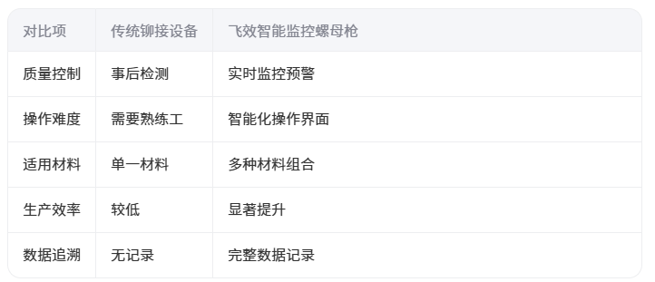 通过上表对比可以看出,飞效智能监控螺母枪在质量控制、操作便捷性、材料适用性和生产效率等方面都具有明显优势。